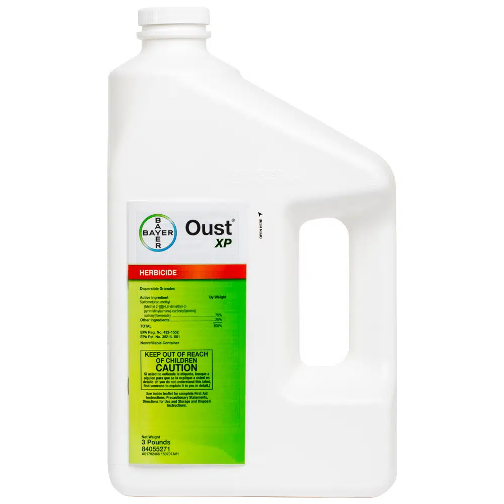 Oust XP herbicide is a dispersible granule that is mixed in water and applied as a spray or impregnated on dry, bulk fertilizer.